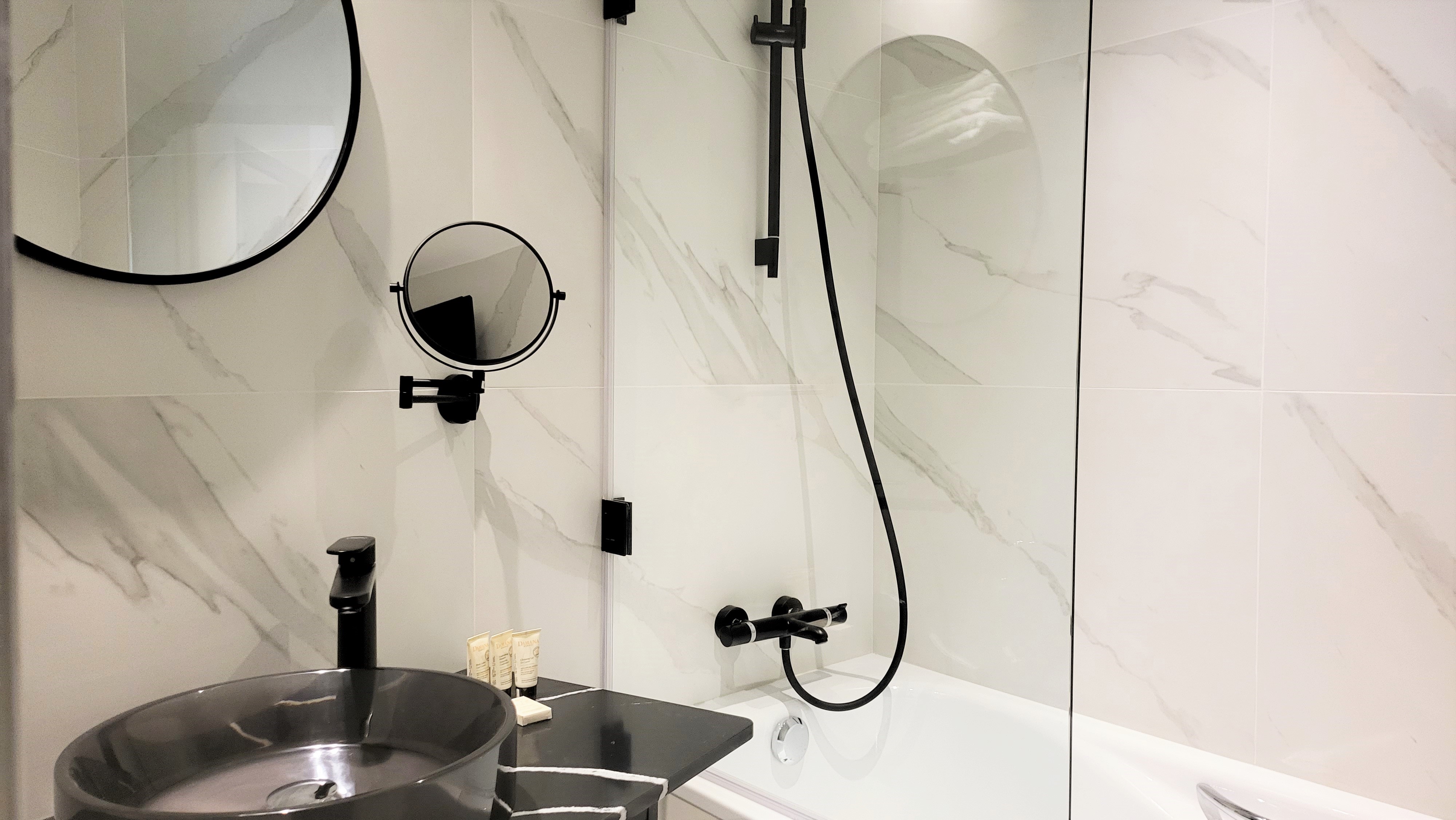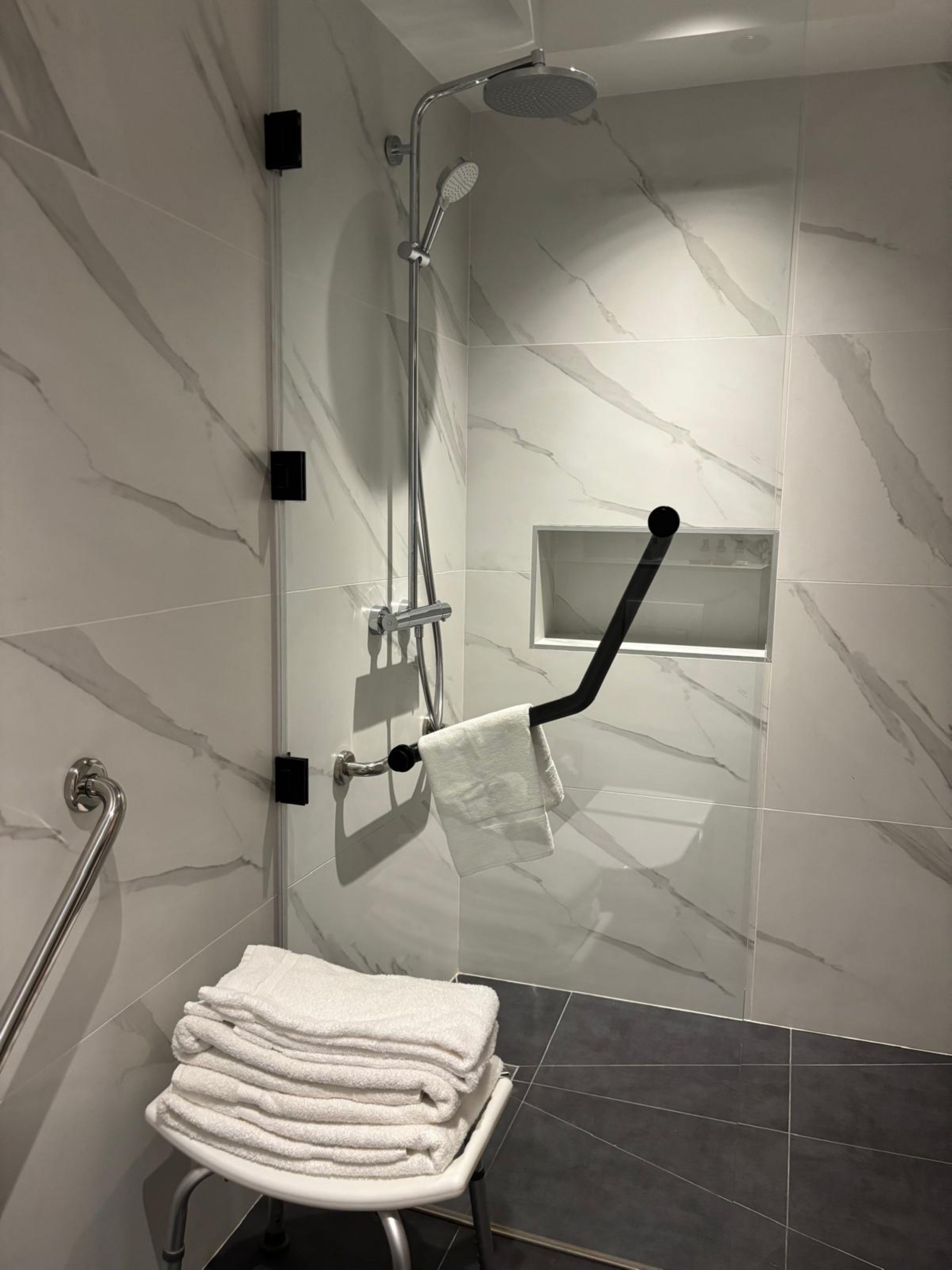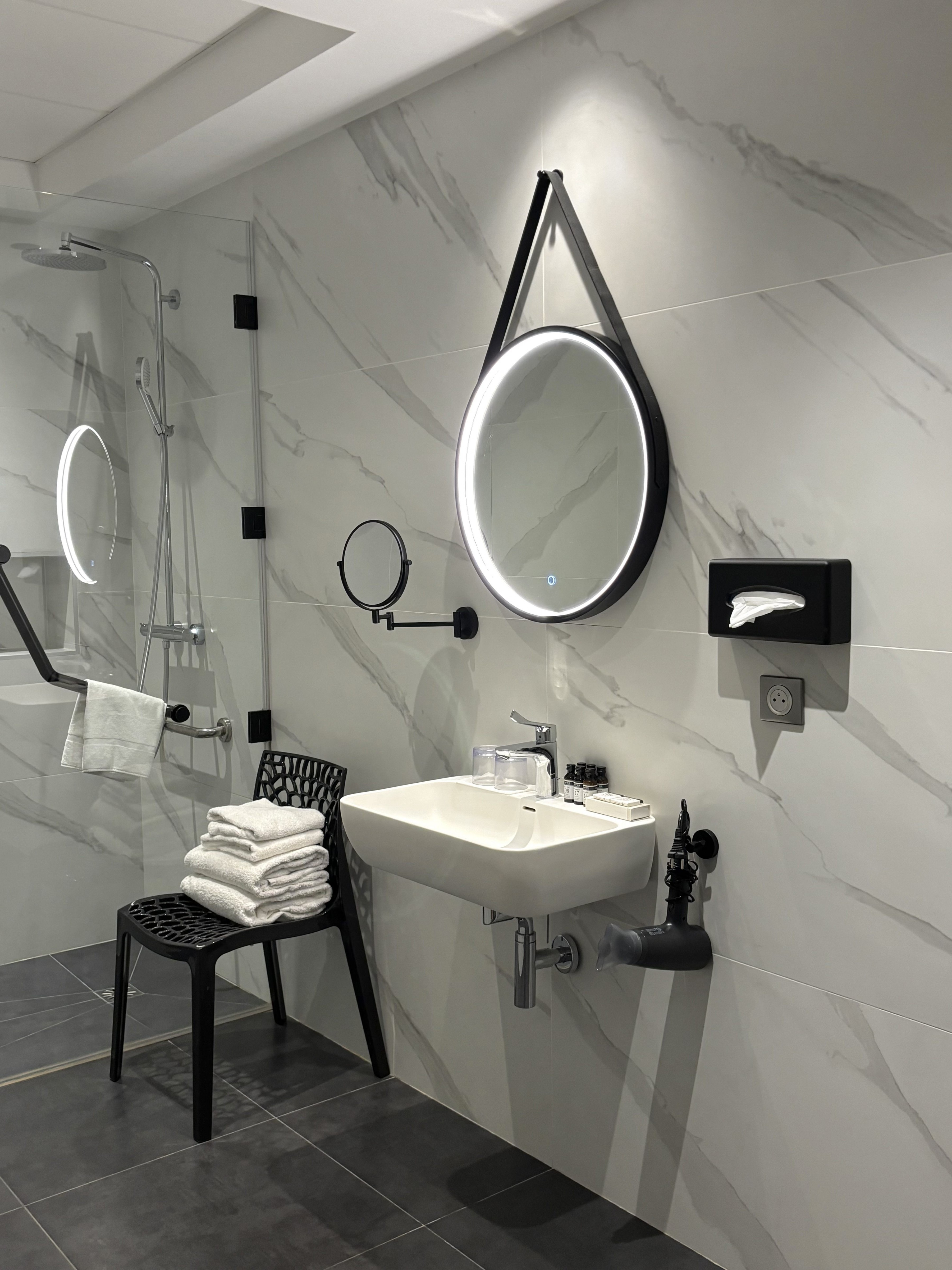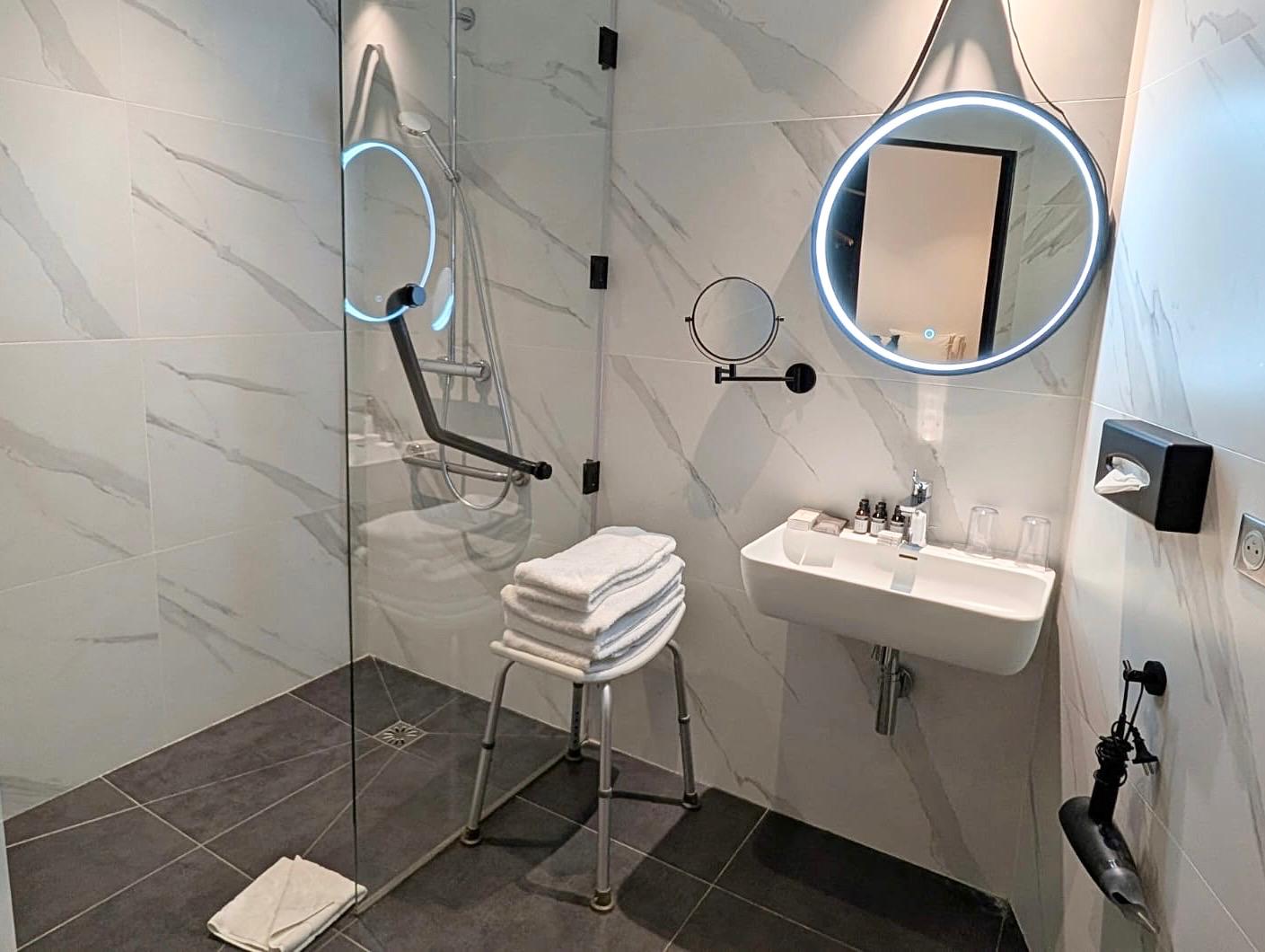 La habitación tiene vistas al patio interior del hotel y dispone de un baño amplio y adaptado.