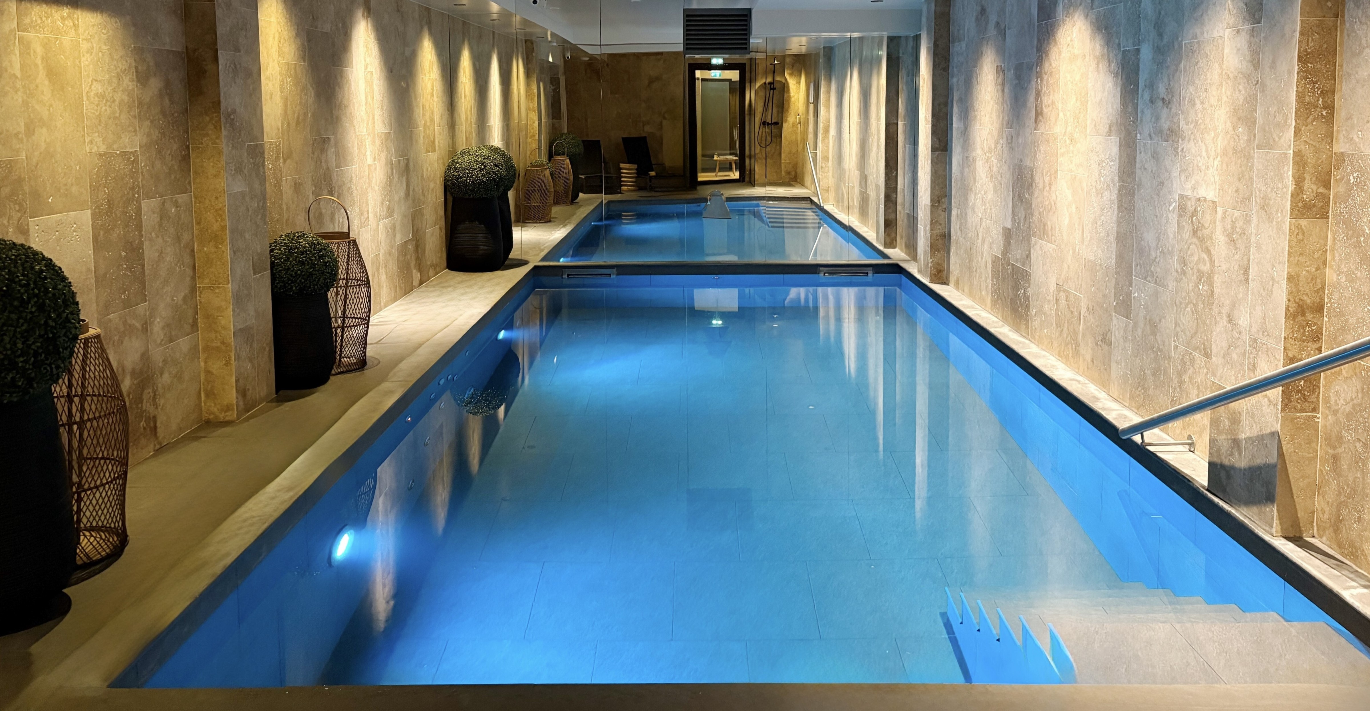 Tras pasar por los vestuarios, relájese en albornoz junto a la piscina de 6 metros o en el área de descanso, con un cóctel en la mano o degustando un delicioso té. Los bancos que la rodean le esperan.